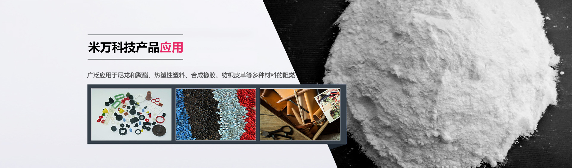 米萬科技在橡膠行業(yè)有一系列研發(fā)的阻燃劑產品。產品不含鹵素,由于表面經過改